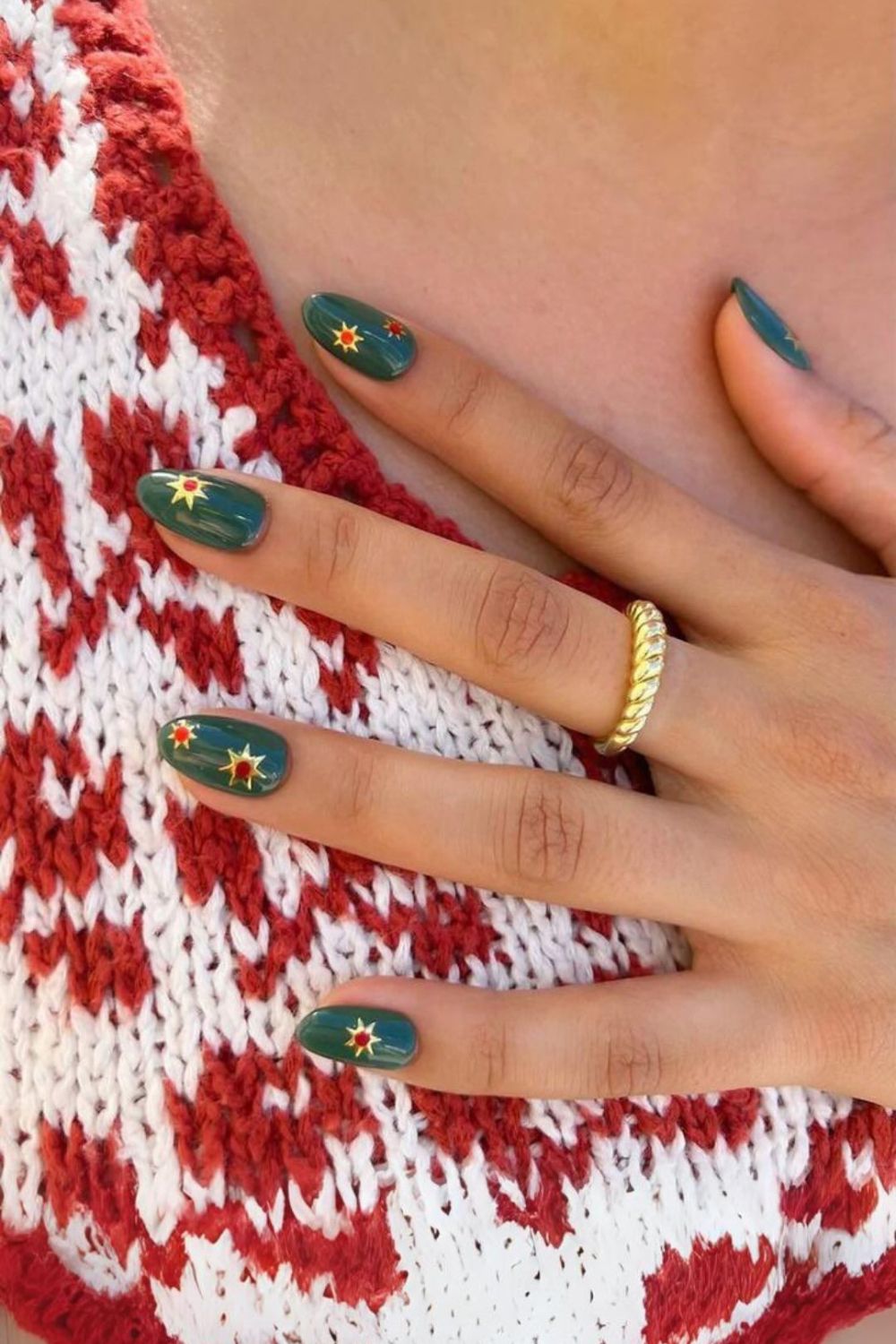 Dark green nails with gold suns? Yeah, you’re definitely giving off those witch-in-the-woods vibes. But chic, obviously.