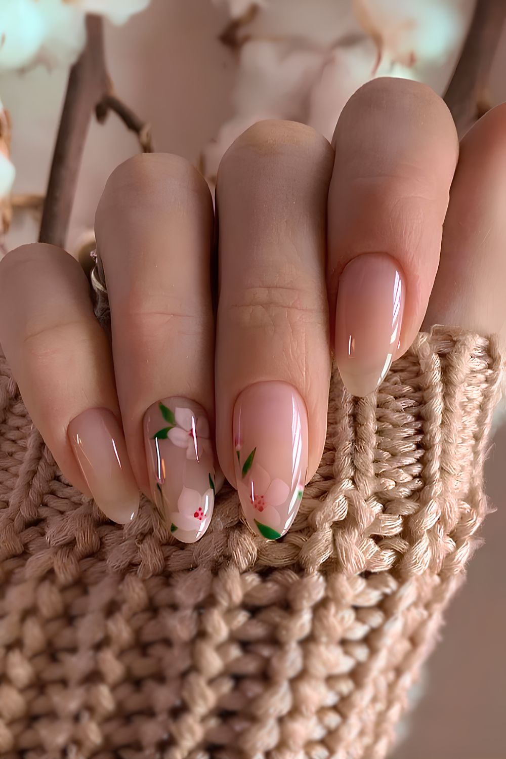 If you want florals but hate anything too busy, this is the way to go. A glossy natural base with cherry blossoms on a few nails, and you’re ready for spring without the color explosion.