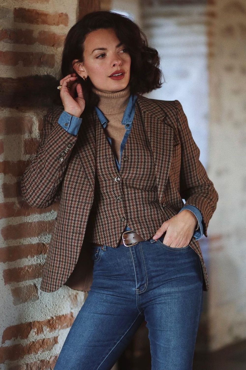 Who says you can’t steal a little swagger from the boys? Go for dark jeans, black turtleneck, and a white shirt with a few buttons undone at the top. Throw on a tweed blazer for that look that means business—yet feels playful. A chic, structured handbag will seal this deal.