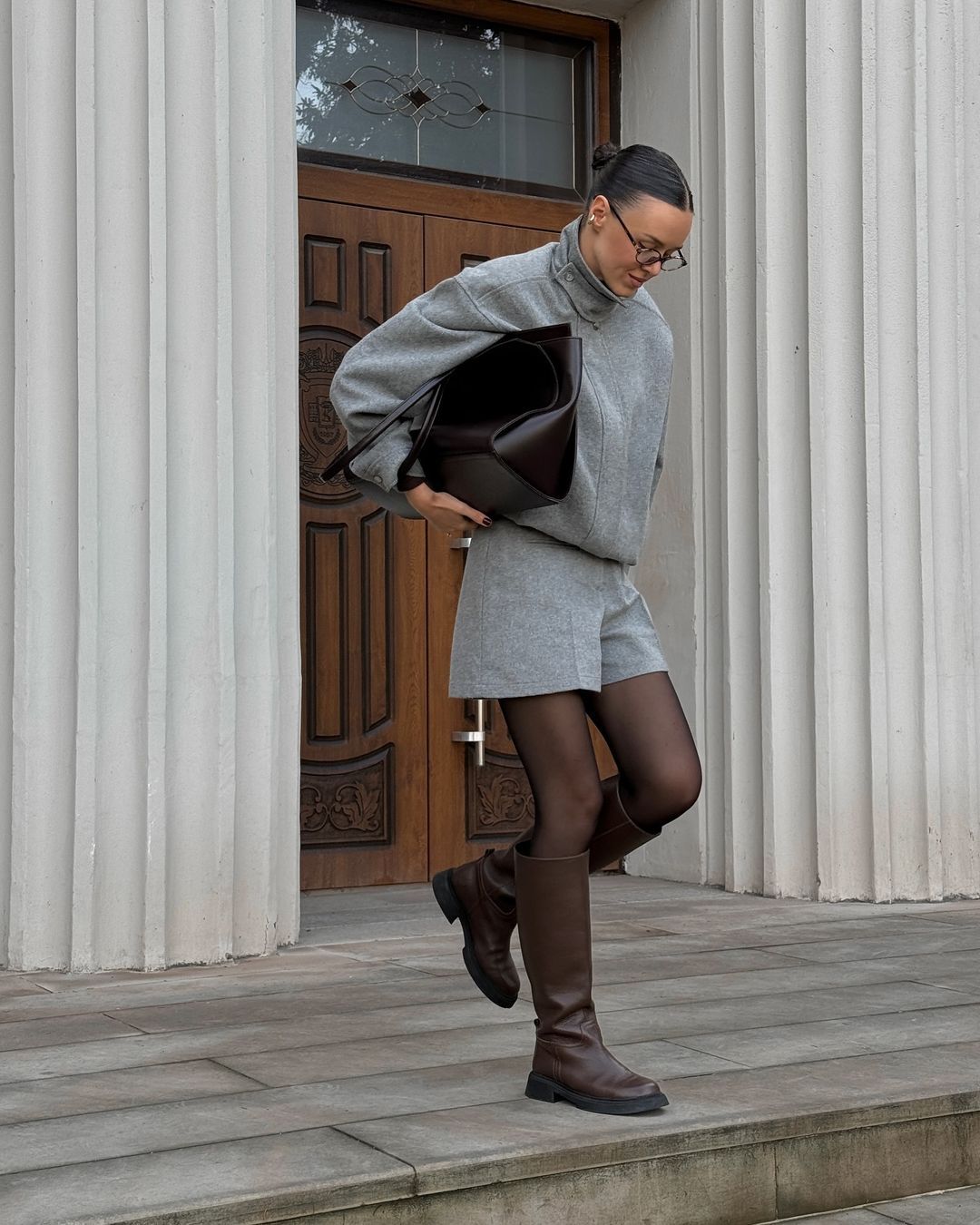 Monochrome done right. A matching gray knit set feels effortlessly coordinated, while black boots anchor the softness with a bit of edge. It’s all about playing with shades and proportions.