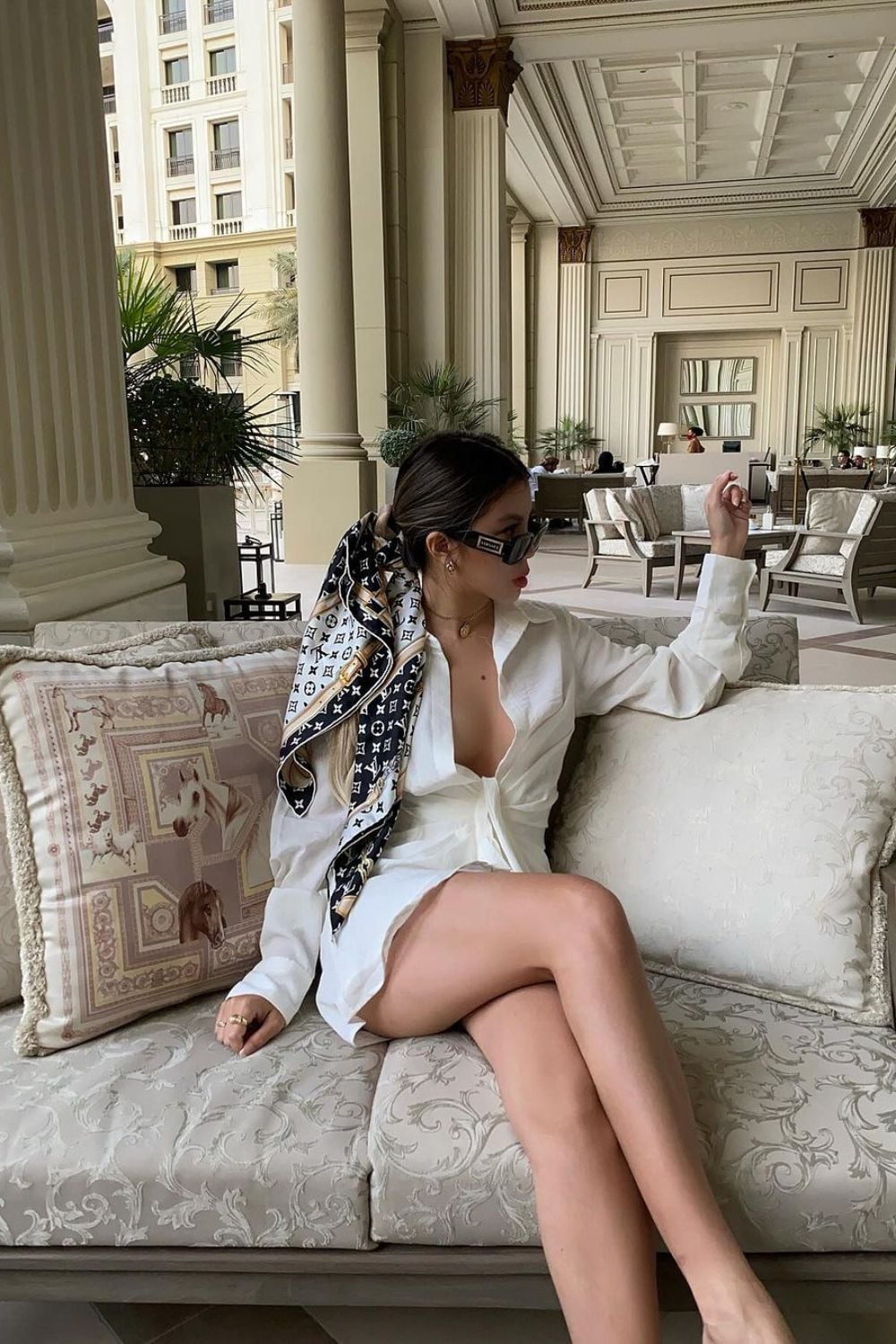 Style the scarf in your hair for an effortlessly chic look that completes your outfit perfectly. Lounging in style!