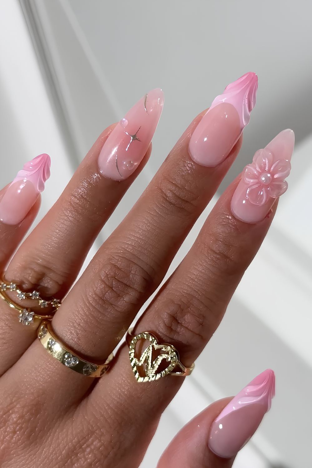 Go with sheer latte washes for “clean-girl” vibes, cat-eye shimmer for sparkle-chasers, or a quick chrome dust on the tips for glazed-pink drama. The hue flatters every shape—from almond to coffin—and pairs with any metal hardware. Add texture (pearls, micro-studs, even a single 3-D floral) and watch it flip from quiet to blingy in one swipe.