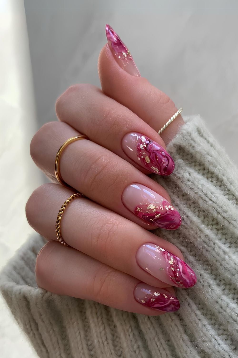 Pink marble but make it designer-level. The glossy finish and gold foil accents = instant luxe energy. Inspired by pink agate, these nails look like they belong on a $200 candle label.