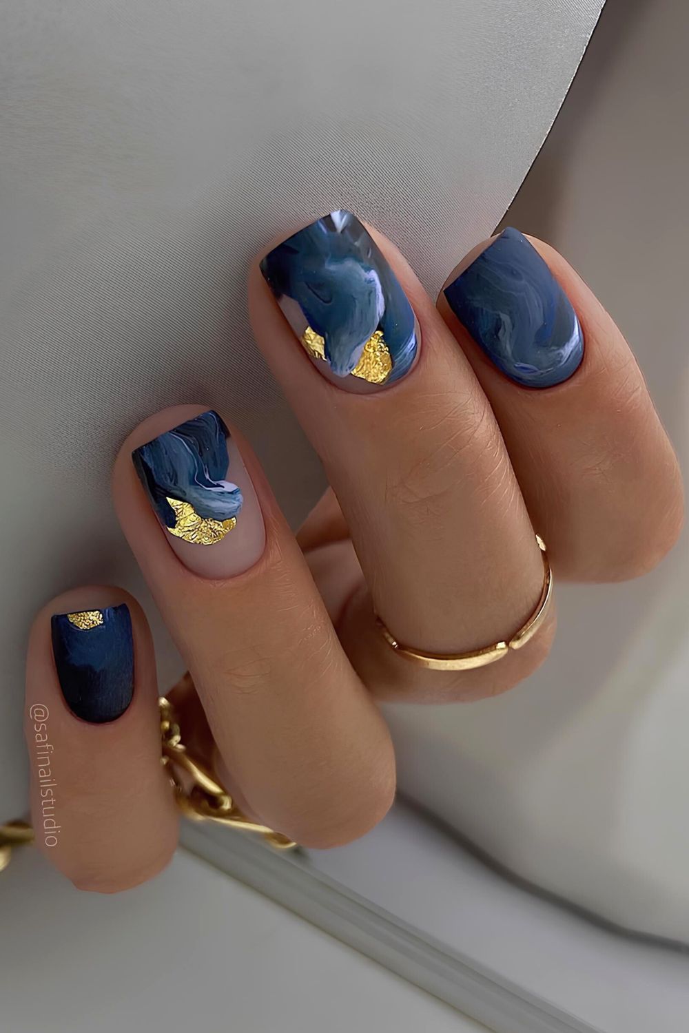 The deep navy, burnt orange, and soft blue swirl together like a dreamy oil painting, while gold flakes add that extra drama. Perfect if you want a bold yet artsy look.