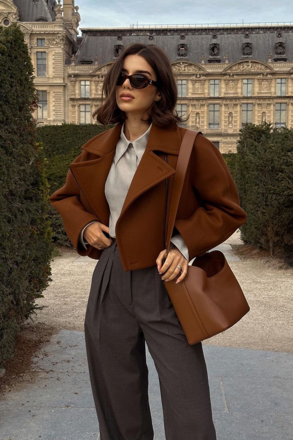 Why choose between classic and modern when you can have both? A cropped brown jacket paired with pleated gray trousers gives off a vibe that says, “I inherited my fashion sense along with my trust fund.” Understated fall luxury at its finest.