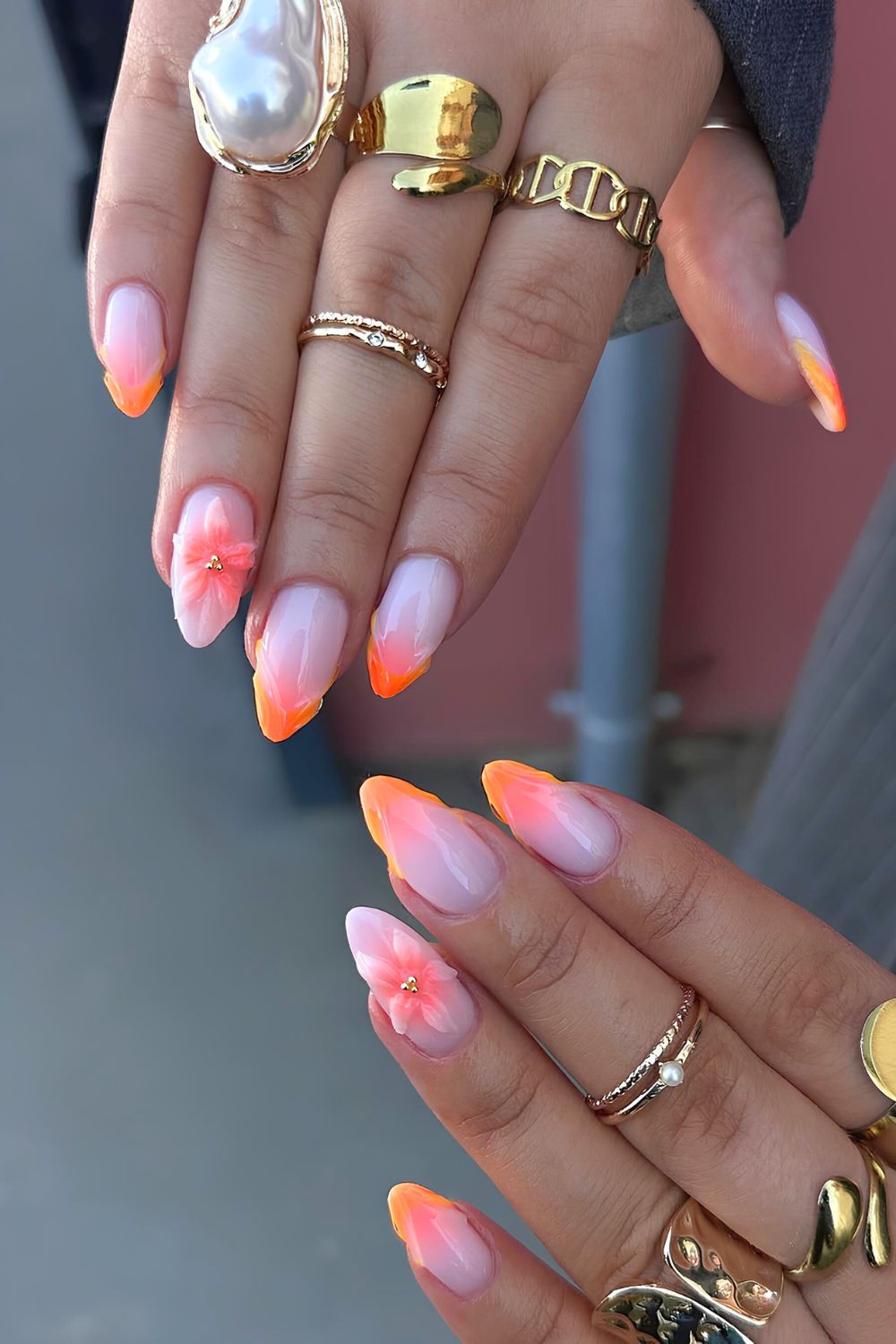 So girlies, whether you love that soft fade ombré look or just want to ease into the color trend, this one’s for you. Smooth transitions from glossy neutrals to bold orange give the viral theory a subtle, polished spin—no loud designs needed.