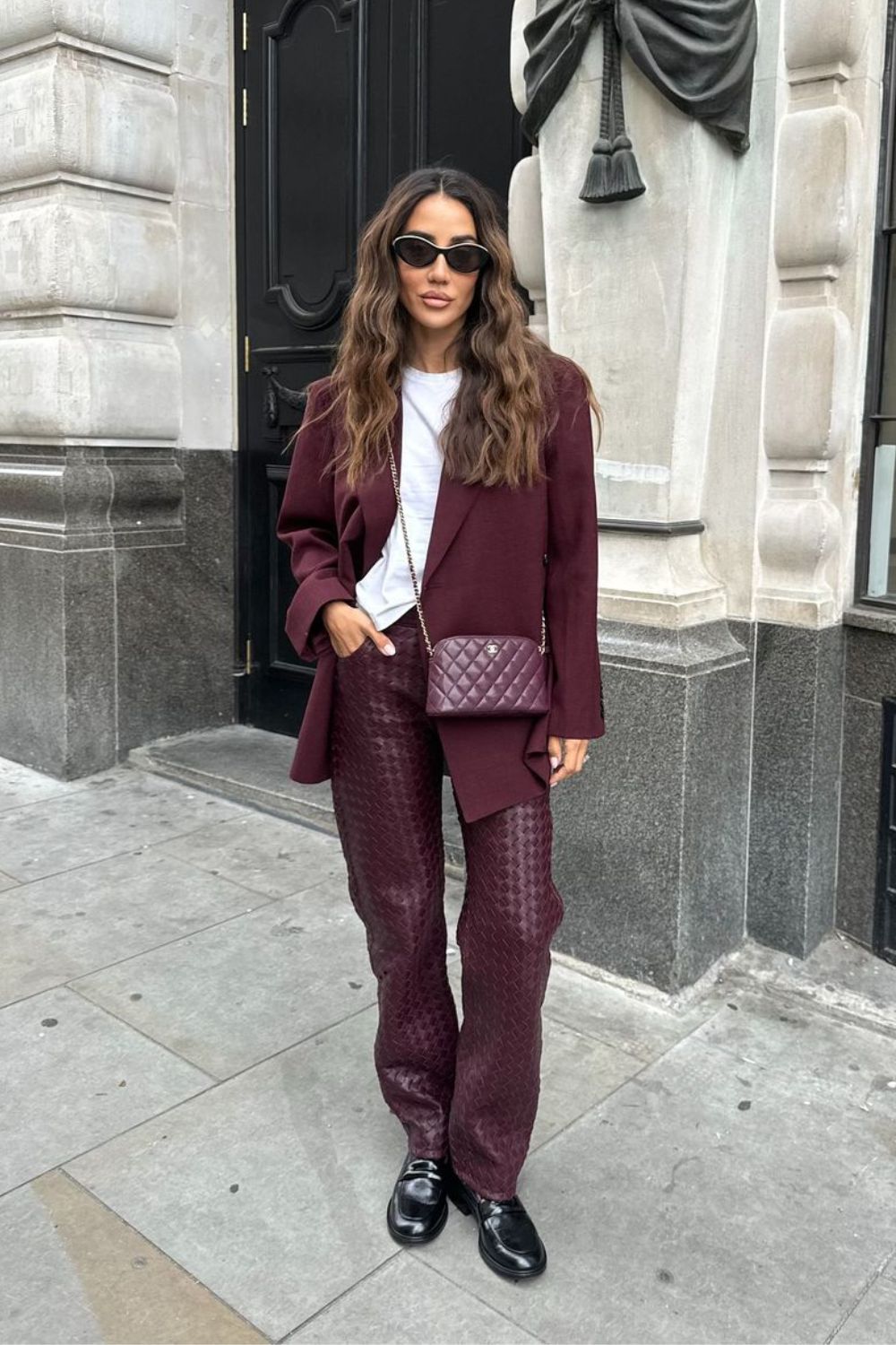 Why settle for boring jeans when you can wear crocs? This burgundy jacket and croc-embossed pants style says, “I’m here to close deals and look fabulous doing it.”