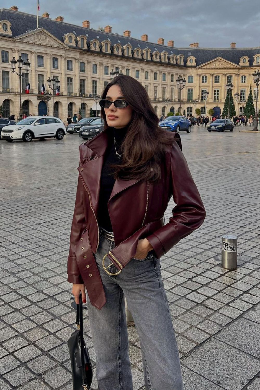 Burgundy is the season’s shade, and this trench is serving all the drama. Rolled-up jeans and pointed flats keep it cool, while the coat does all the talking. Effortless yet runway-worthy.