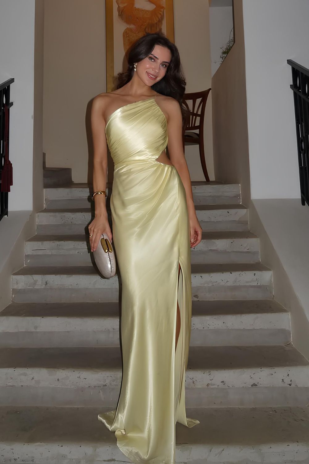 Butter yellow’s 2025 comeback is personal. One-shoulder cut, silky finish, and a slit that says “don’t worry, I can still dance.” Looks straight off a Pinterest board and belongs at every chic garden wedding.