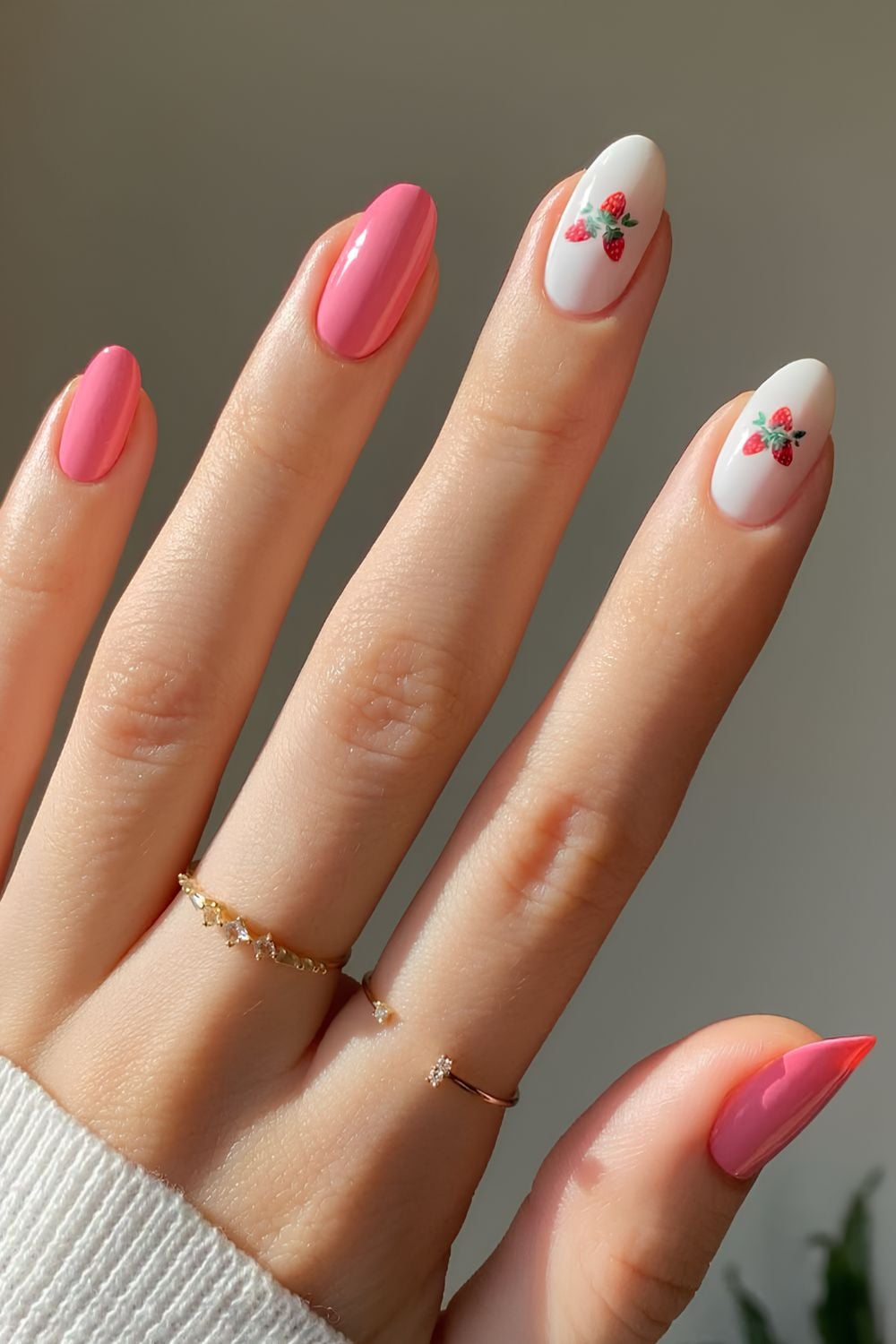 Alternate pink and white nails, then add tiny strawberry art. The white accents make red berries pop harder and play into 2025’s obsession with clean accents and micro-detailing.