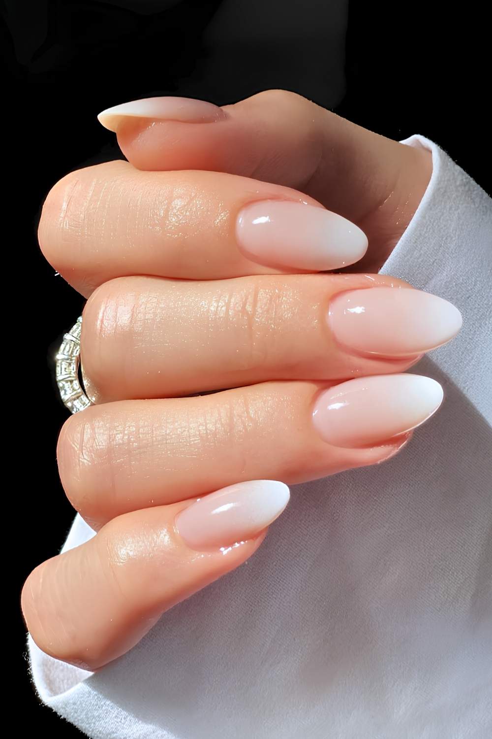 Ombré blend adapts to basically every nail shape, but it doesn’t behave the same on all of them. Almond nails are the most flattering for white gradients – they give the blend space to flow and make fingers look longer.